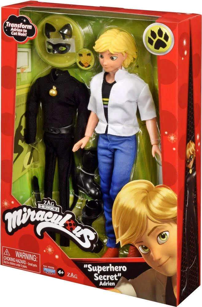 Ce secret ne devra jamais être révélé… Avec la poupée Adrien et son costume de super héros, il est désormais possible de transformer Adrien en Chat Noir pour sauver Paris ! 1 poupée 26 cm et ses accessoires. Ne convient pas à un enfant de moins de 36 mois. Contient de petits éléments susceptibles d’être avalés.