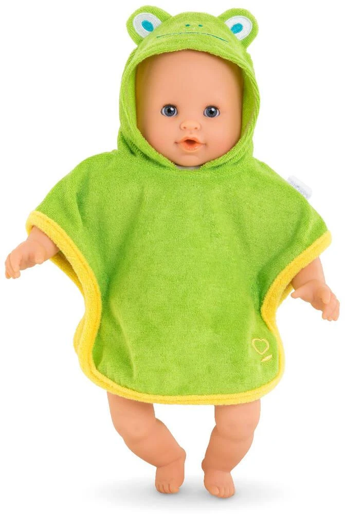 Cette amusante cape de bain à la capuche « tête de grenouille » séchera et réchauffera les petits poupons de 30 cm à la sortie du bain.