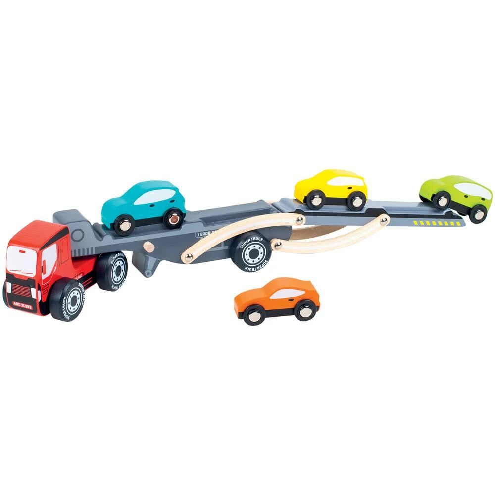 Camion de transport de véhicules en bois. Avec 4 voitures incluses de 7 cm de long. Camion de transport avec remorque détachable. En basculant manuellement le niveau supérieur de la remorque vers l’arrière, tu pourras décharger les voitures. Voitures : Compatible avec les sets de train et d’automobile en bois (vendus séparément). Développement de l’imaginaire. Facile à manipuler. Dimensions du camion de transport : 28,5 x 5.6 x hauteur 15 cm avec les voitures chargées (sans 12 cm). Longueur du camion ouvert 45 cm (niveau supérieur basculé).