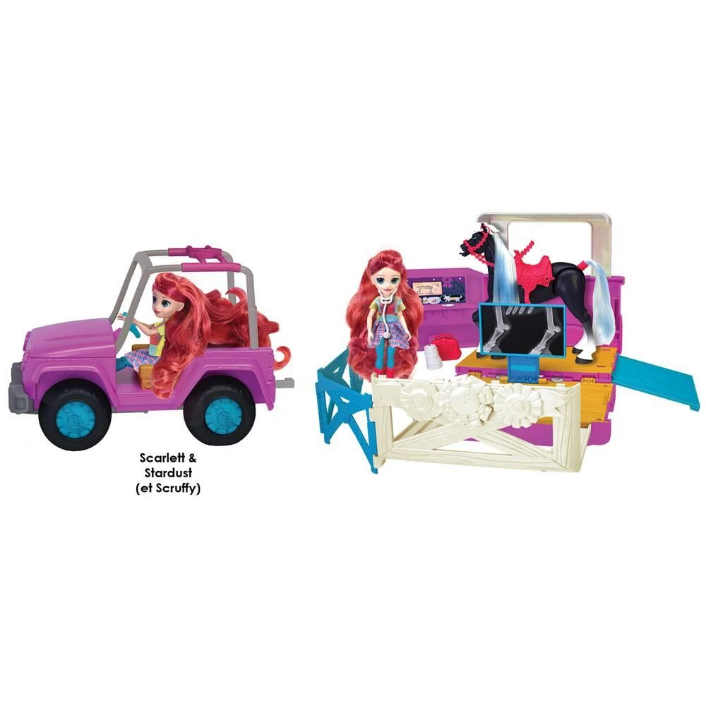 La Remorque se transforme en Centre Vétérinaire! Examine tes chevaux grâce à la Radio! Contient 22 pièces, dont 1 poupée 12 cm et 1 cheval 17 cm exclusifs.