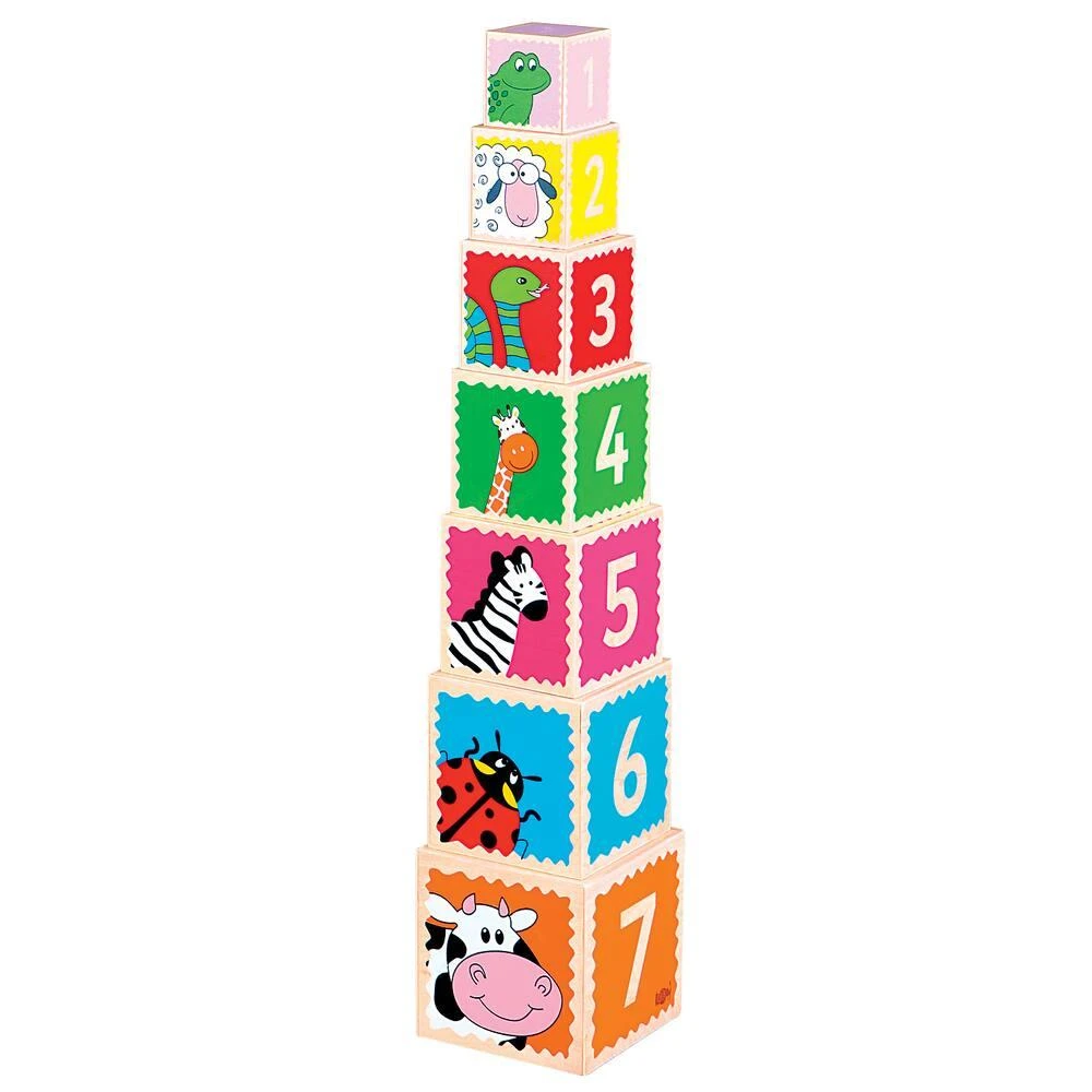 Sept cubes en bois pour apprendre à compter jusqu’à sept. Un animal par cube : grenouille, mouton, tortue, girafe, zèbre, coccinelle et vache. Découverte des formes et des couleurs.