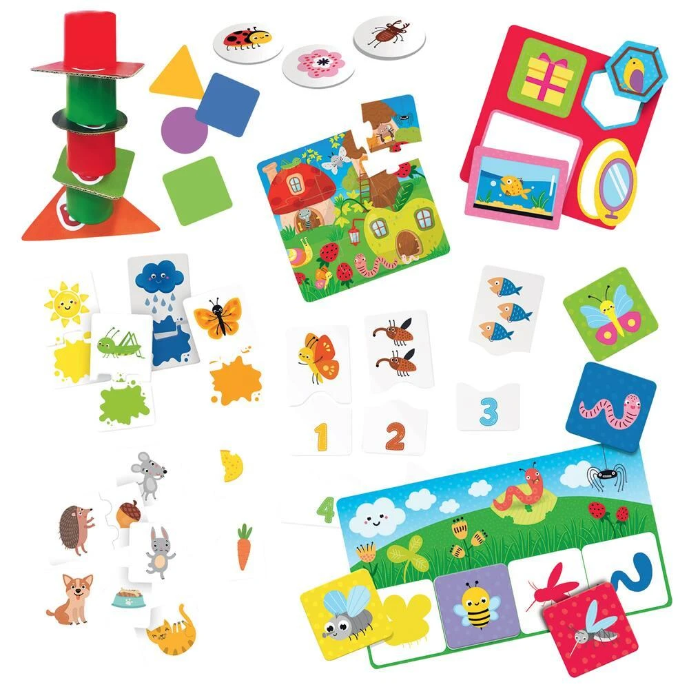 Coffret éducatif qui réunit les premiers jeux des petits (puzzles, formes à empiler, mémos…). L’enfant développe sa logique, sa motricité fine, son observation.