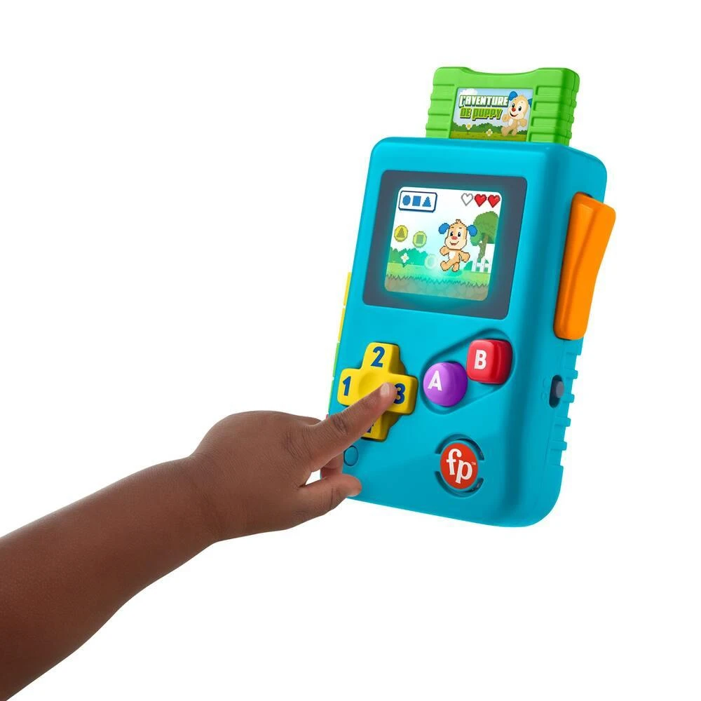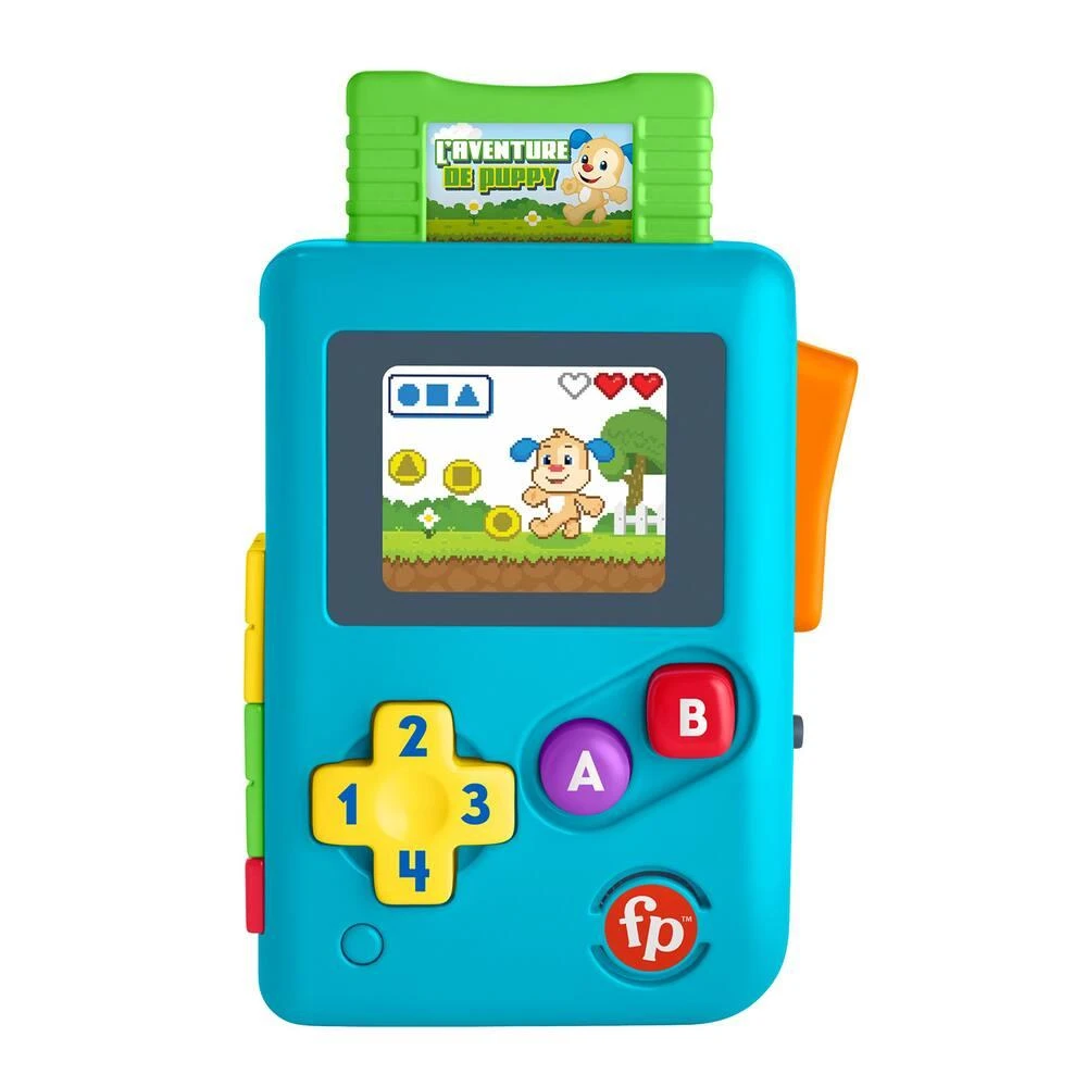 Initiez bébé aux jeux vidéo d’époque avec Ma première console de jeu Rires et Éveil de Fisher-Price. Elle tient dans les mains de bébé et ressemble à s’y méprendre à une vraie console avec sa commande directionnelle et ses boutons A et B, sa fausse cartouche de jeu et son écran qui s’allume. Quand bébé appuie sur les boutons, il entend des chansons, des sons et des phrases rigolotes qui l’initient aux directions, aux couleurs, aux chiffres et aux formes.