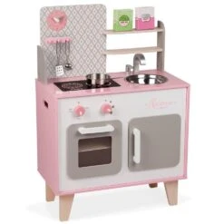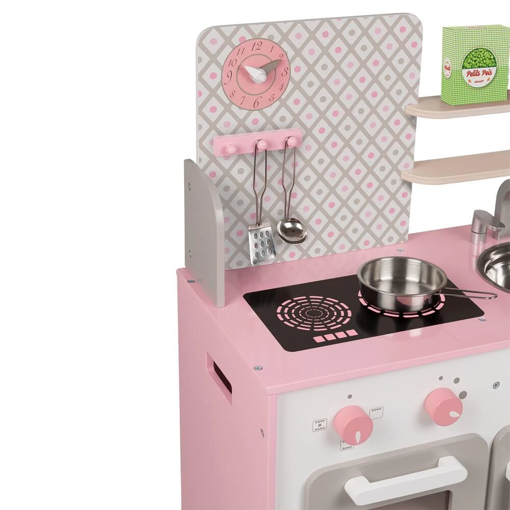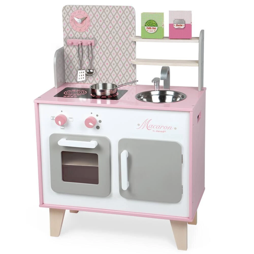 Comme papa et maman, prépare de bons petits plats pour tes amis et deviens un vrai Petit Chef !!! Maxi cuisine Macaron toute en bois avec une patère pour suspendre les 2 cuillères en métal, 1 poêle en métal et 2 boites d’aliments en carton (petits pois et sucre). Comme une véritable cuisine, elle est équipée de 2 boutons rotatifs avec bruitage pour allumer les 2 plaques à induction, d’un four et d’un placard avec portes magnétiques, d’un évier en inox et d’une horloge. Hauteur du plan de travail : 50 cm. Bois : MDF (parties peintes), contreplaqué (étagère à l’intérieur), acier inoxydable (évier et visserie). Peinture standard, impression par transfert à chaud. Livrée non montée. Boite couleur fermée avec poignée plastique.