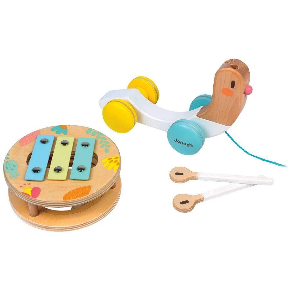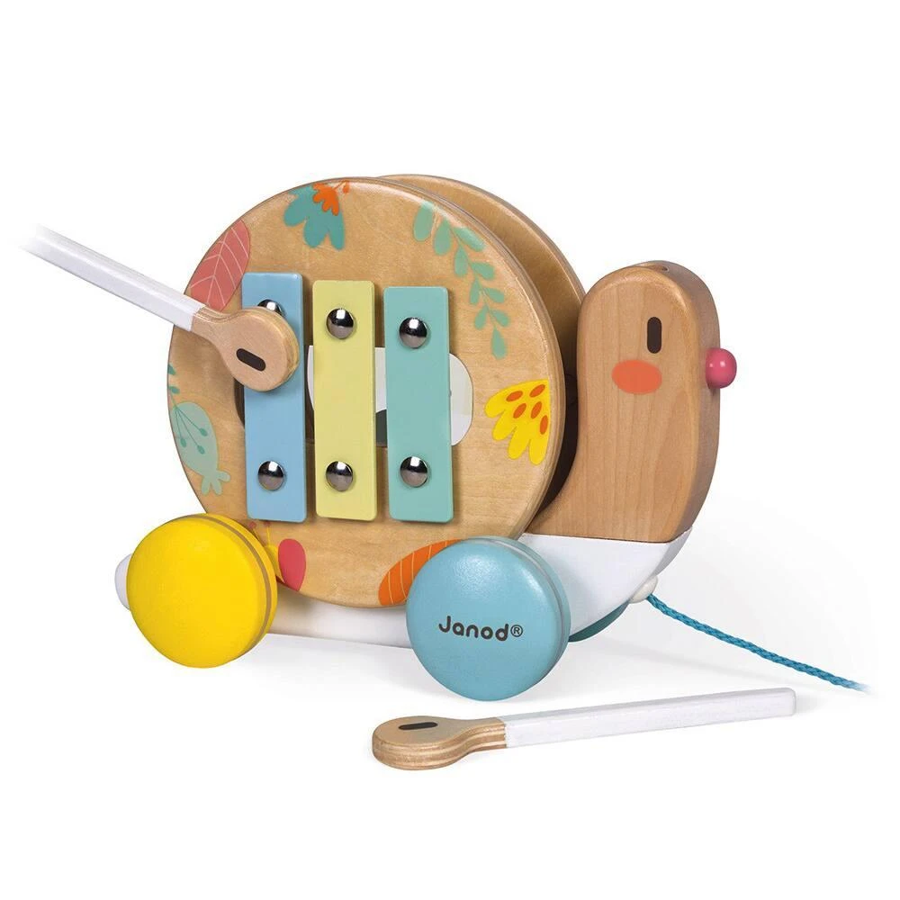 Un escargot rigolo à promener dans des tons très doux et très actuels. La coquille tourne lorsqu’on le promène et s’enlève pour révéler un tambourin et un petit xylophone ! Les antennes de l’escargot sont également amovibles et forment les baguettes. Pour éveiller votre enfant à la musique de façon ludique ! Peinture à l’eau. Bois : hêtre et contreplaqué.