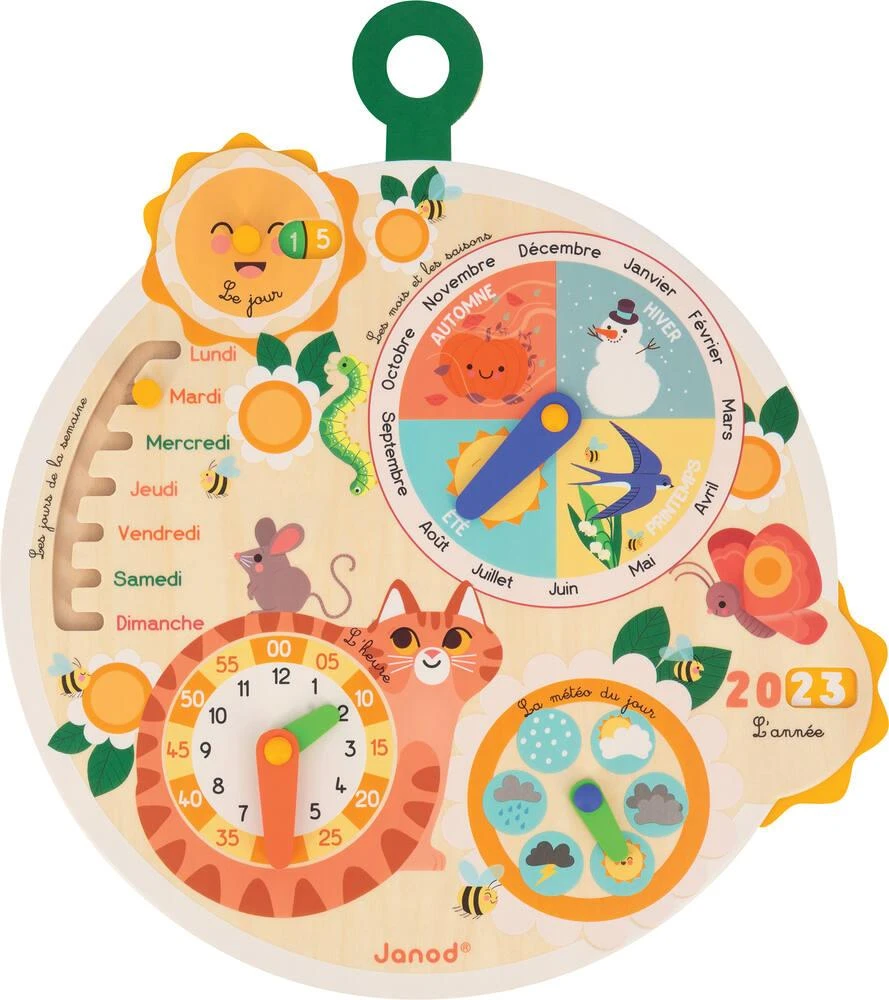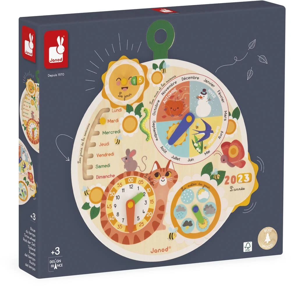 TIC…TAC, le temps est une notion difficile à apprendre. Grâce à ce jouet, votre enfant va apprendre à se repérer dans le temps tout seul et à son rythme. Un soleil tourne pour indiquer la date, un curseur permet d’apprendre les jours de la semaine, une horloge avec 2 aiguilles de couleur permet de différencier les heures et les minutes, un cadran météo pour que votre enfant apprenne à s’habiller seul, et enfin un cadran pour comprendre les saisons et les mois. Cette roue du temps comporte également une petite roue pour faire défiler les années (valable 10 ans, 5 ans sur une face, 5 ans sur l’autre). La roue peut être accrochée au mur. Jouet d’éveil en bois pour les enfants – Jouet en bois FSC™.