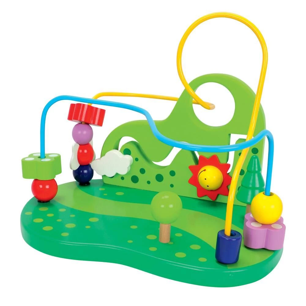 Labyrinthe avec 2 loopings sur lesquels on fait glisser 9 perles ou éléments de différentes formes et couleurs. On peut aussi faire bouger dans le décor le soleil et le nuage. La base a aussi en décor deux jolis arbres. Développement de la motricité : stimule la coordination main-œil. Léger et facile à manipuler.