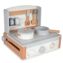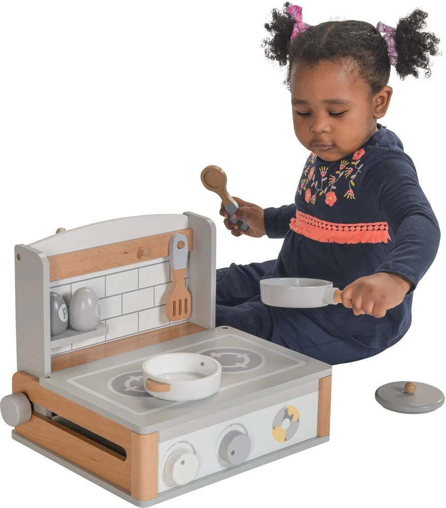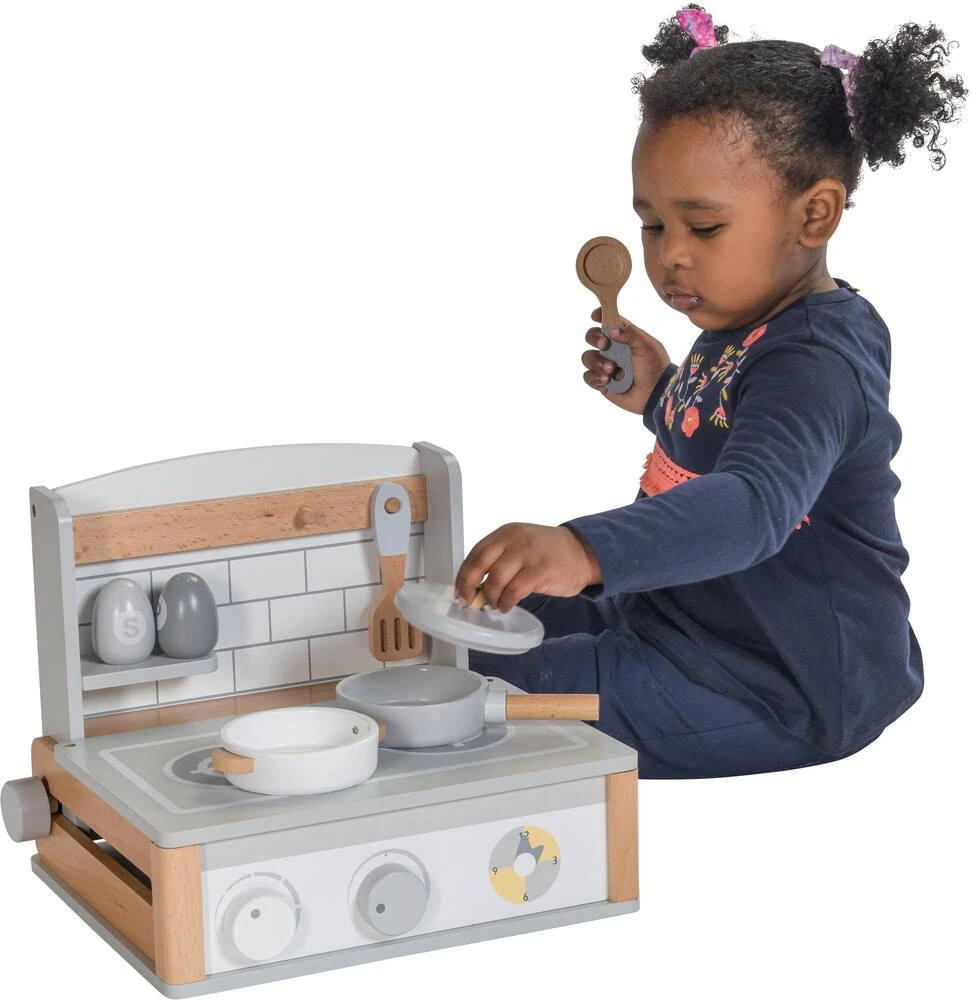 Petite cuisine de table avec une plaque de cuisson. Tout le nécessaire pour cuisiner comme un petit chef ! Inclus : une casserole avec couvercle, 1 poêle, une cuillère, 1 spatule, 1 salière et 1 poivrière. En bois. Développement de l’imaginaire et de la motricité. Pratique pour un gain de place et un transport plus facile : la crédence coulisse sous la plaque de cuisson. Poids de la cuisine nomade : 2.7 kg. Dimensions de la cusisine : ouverte 33.5 x 28.2 x 26.1 cm, fermée 33.5 x 29.5 x 9.7 cm.