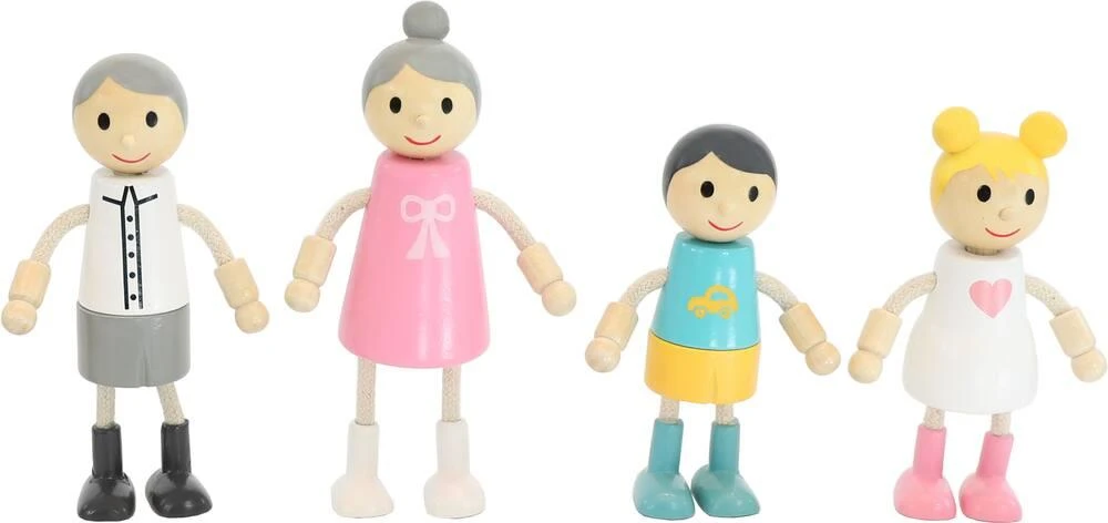 Coffret de 4 poupées en bois pour maison de poupées : Le papi , la mamie (11.5cm), la petite fille et le petit fils (10 cm).