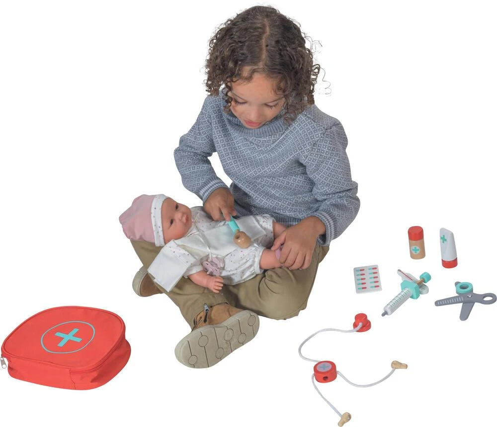 Contient tout le nécessaire pour les premiers secours dont : 1 mallette en tissu avec fermeture zippée, 1 stéthoscope, 1 seringue, 1 marteau à réflexes, 1 thermomètre, 1 paire de ciseaux, 1 tablette de médicaments et 2 récipients. Développe l’imaginaire et la motricité. Trousse en polyester, dimensions 23,5 x 18 x 6 cm. Tous les accessoires peuvent être rangés dans le sac de transport coloré.