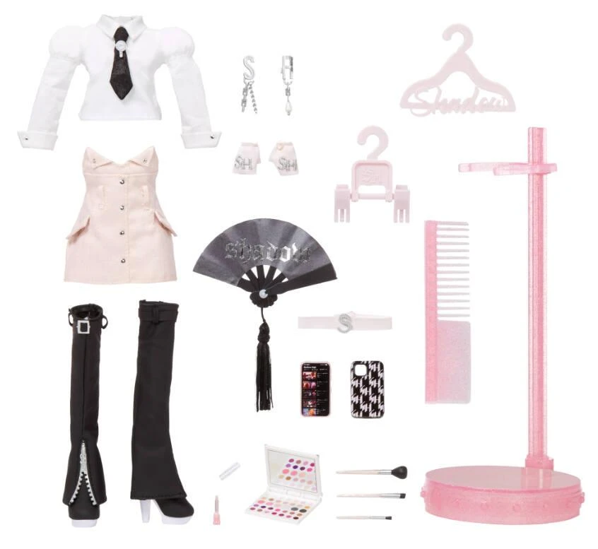Une poupée de mode, une tenue de poupée complète, une paire de chaussures de poupée, des accessoires de poupée, un ventilateur, un téléphone portable + un étui, une palette de maquillage, des pinceaux et un support de poupée. Entièrement articulée. Sa tête, ses bras, ses bras et ses jambes se plient dans de nombreuses poses amusantes, y compris le grand écart ! Vous pouvez également le placer sur le support de poupée inclus. Karla Choupette est rose clair de la tête aux pieds. Elle exprime son propre style dans une robe rose et blanche avec des poches latérales et des détails argentés, une chemise et une cravate blanches, une ceinture à boucle S, des gants, des boucles d’oreilles, une paire de bottes hautes avec fermeture éclair et des accessoires amusants, dont un pompon. main du ventilateur. Et elle a de beaux cheveux longs roses bouclés, de longs vrais cils et des yeux de verre.
