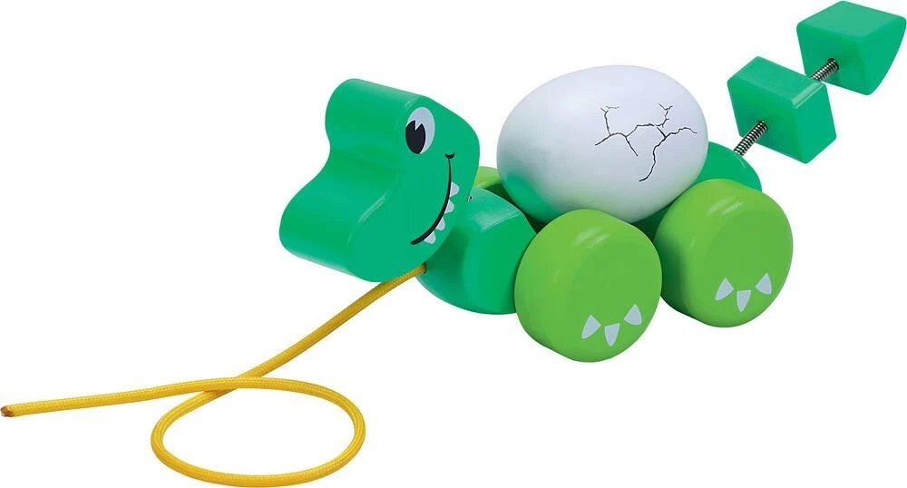 Petit dinosaure en bois à tirer pour voir le mouvement de l’œuf sur son dos. Stimule la coordination œil-main et l’équilibre de l’enfant.