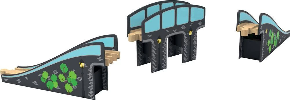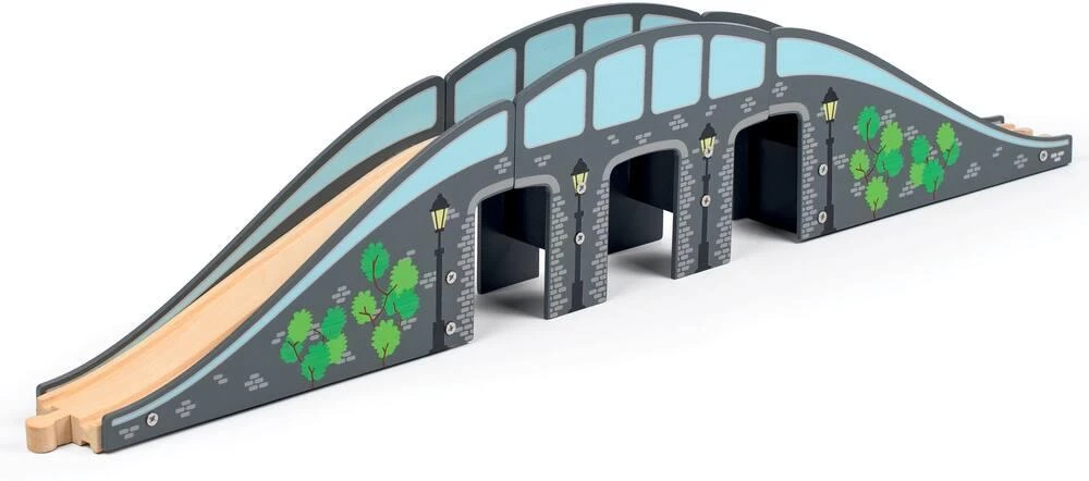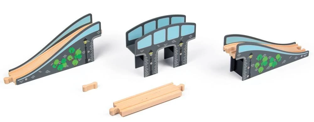 5 pièces. Un grand pont qui peut s’utiliser en une seule pièce ou en 3 pièces. Longueur : 45 ou 60 cm. Compatible avec la gamme de train en bois. Fabriqué en bois certifié. Notice de montage incluse. Bénéfices pour l’enfant : développement de l’imaginaire, apprentissage des objets, léger et facile à manipuler.