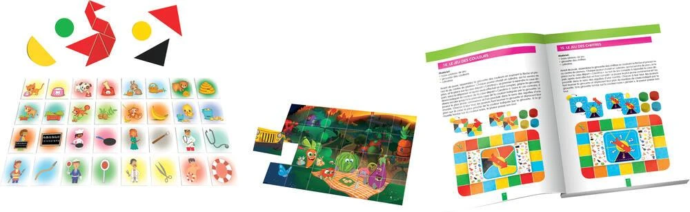 30 jeux éducatifs pour s’amuser sur le bureau de Carotina. Le jeu comprend un stylo effaçable pour apprendre à écrire et à dessiner. Le jeu inclut aussi un guide illustré pratique pour les parents, qui décrit tous les jeux et les activités, dont le Tangram, les jeux de mémoire et de parcours, et bien plus encore. Apprends les chiffres, les formes, les couleurs, les animaux. 1 bureau robuste, taille: 47x37x26. 5cm.