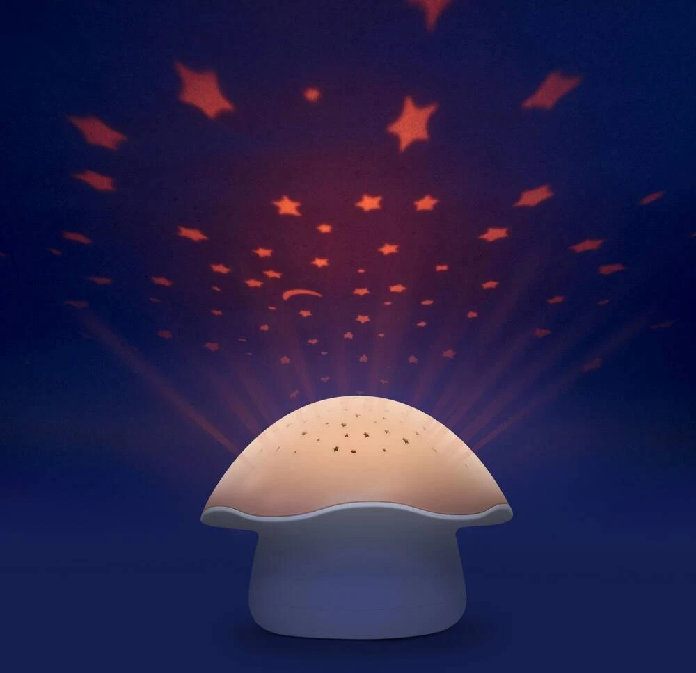 Le projecteur champignon crée un ciel étoilé au plafond pour aider bébé à s’endormir. Les étoiles changent doucement de couleur mais il est aussi possible de choisir sa couleur préférée et de la figer (bleu, orange ou vert). Musical, il émet une douce berceuse (2 volumes) ou des bruits blancs de battements de cœur pour que les tout-petits s’endorment encore plus facilement.