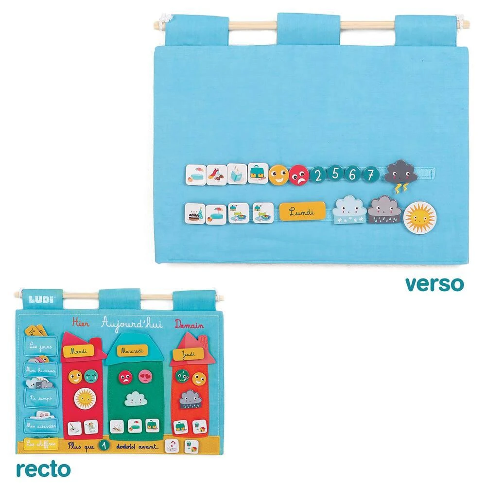 Une idĂ©e pour accompagner les enfants dans leur quotidienLe Panneau en tissu «  »Le temps qui passe » » aide les petits Ă se repĂ©rer dans le temps grâce aux diffĂ©rents Ă©lĂ©ments amovibles. Les enfants peuvent suivre le cours de la semaine en notant le jour d’hier, celui d’aujourd’hui et celui de demain. Ils peuvent Ă©galement prĂ©ciser leur humeur, la mĂ©tĂ©o et enfin toutes les activitĂ©s rĂ©alisĂ©es et programmĂ©es jour après jour.Pour Ă©viter les mauvaises surprises, les petits stress et pour aider les petits Ă patienter, les enfants peuvent Ă©tiqueter le nombre de « dodos » avant la prochaine activitĂ©.AccompagnĂ©s de leurs parents pour les guider, les enfants s’amuseront Ă organiser leur semaine et Ă mieux apprĂ©hender le temps qui s’écoule.Un outils astucieuxLe panneau est composĂ© de 3 maisons « hier », « aujourd’hui » et « demain ». Les enfants piochent, dans les petites pochettes dĂ©diĂ©es, le jour de la semaine, l’humeur qui lui correspond, la mĂ©tĂ©o et ses deux activitĂ©s principales de la journĂ©e. Les Ă©tiquettes amovibles sont faciles Ă manipuler pour les petites mains et se scratchent facilement sur le panneau. A son dos, les enfants peuvent ranger les pièces dont ils n’ont pas besoin pour ne rien perdre.L’ensemble des Ă©tiquettes amovibles : 7 jours de la semaine, 7 chiffres (de 1 Ă 7), 11 climats (le vent, la pluie, l’orage, la neige, le ciel nuageux, le soleil), 21 activitĂ©s (l’école, la cantine, le sport, la musique, la maison, la fĂŞte, les courses, la piscine, le coloriage, etc.) et enfin 11 humeurs (joie, amoureux, colère, tristesse, malade et peur).Panneau en tissu brodĂ©. ComposĂ© de coton et de feutrine.60 Ă©tiquettes amovibles en carton imprimĂ©.Dimension du panneau : 38 x 30 x 1 cm.Panneau lavable avec un chiffon humide. SĂ©chage Ă plat.AdaptĂ© pour les enfants Ă partir de 3 ans.Attention : petits Ă©lĂ©ments, danger d’Ă©touffement.