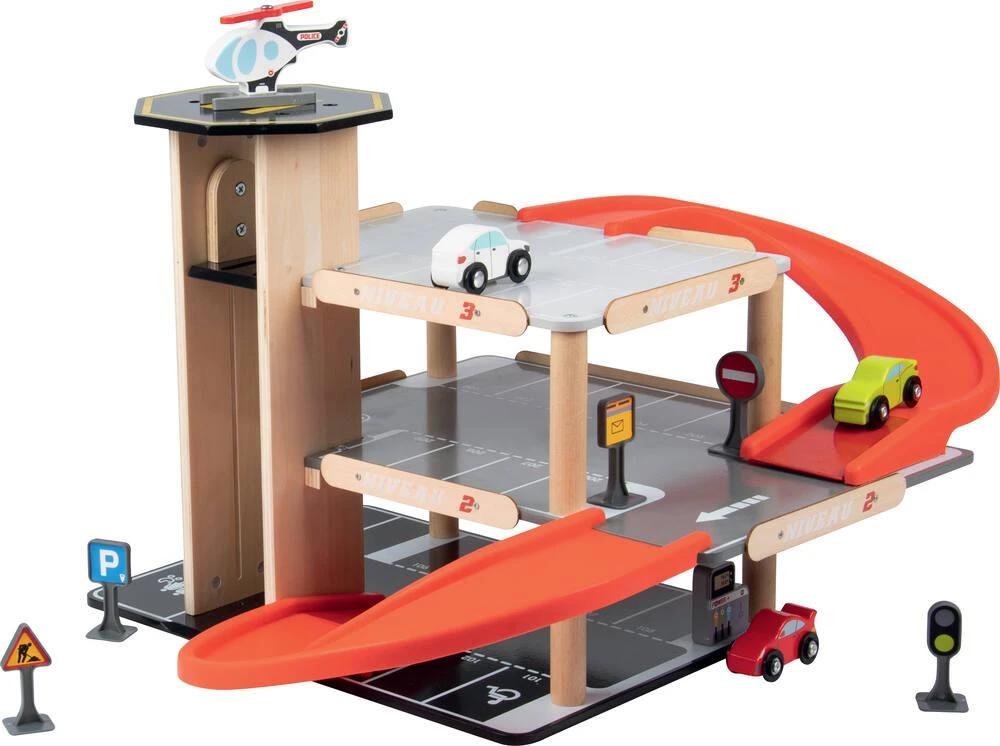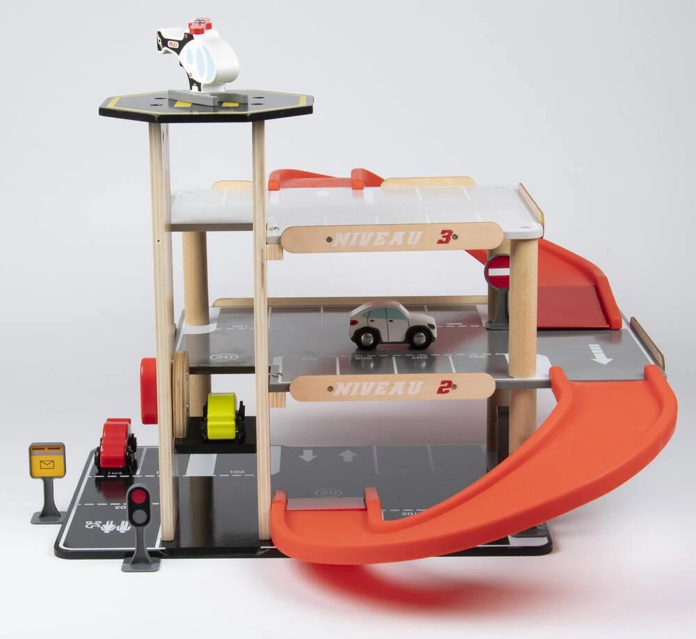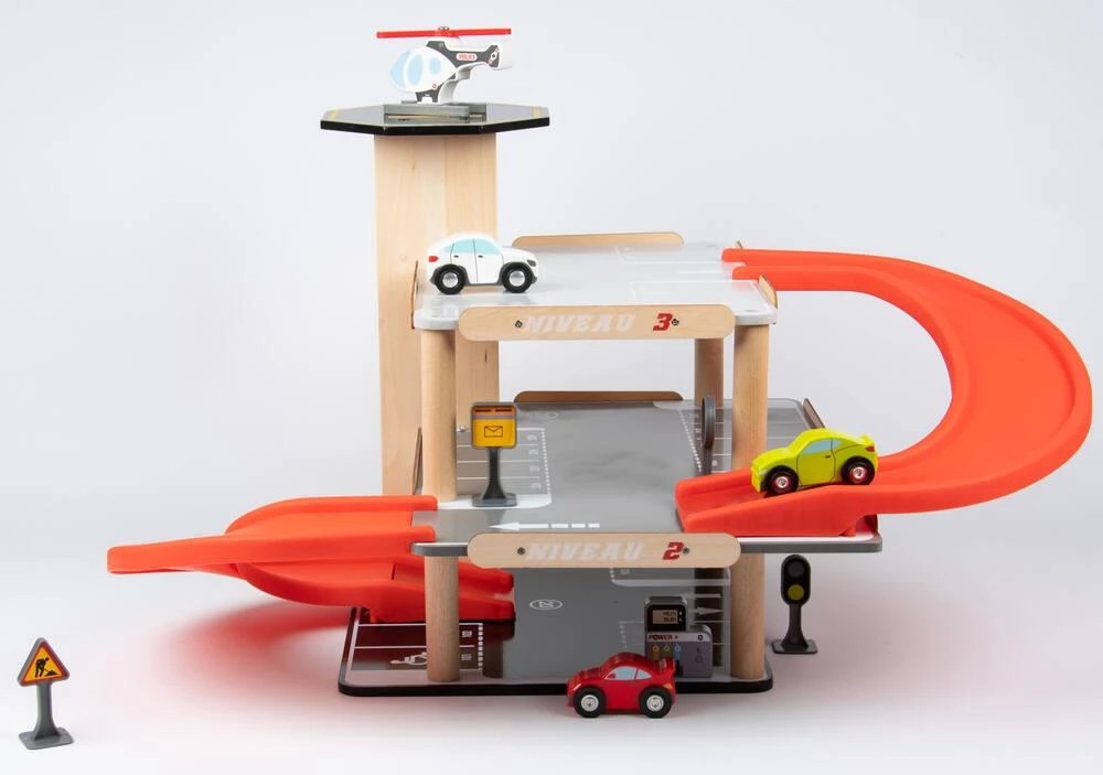 Parking sur 3 niveaux avec ascenseur. Livré avec 3 voitures, un hélicoptère, une pompe à essence et des panneaux de signalisation. Facile à monter. Notice de montage incluse. Développement de l’imaginaire. Apprentissage des objets. Léger et facile à manipuler. Matière(s) du produit : garage et véhicule en bois, rampe et panneaux en plastique. Parking 3 niveaux avec ascenseur, station-service et héliport de secours. 27 places de parking numérotées dont 1 place pour personnes à mobilité réduite et une place pour une famille sur 3 niveaux. 1 rampe pour lancer les voitures. Ascenseur pour voitures qui permet de monter jusqu’au 3ème niveau. 1 station-service. 1 héliport sur le toit de la tour. 3 petites voitures et un hélicoptère. 5 panneaux de signalisations avec stickers.