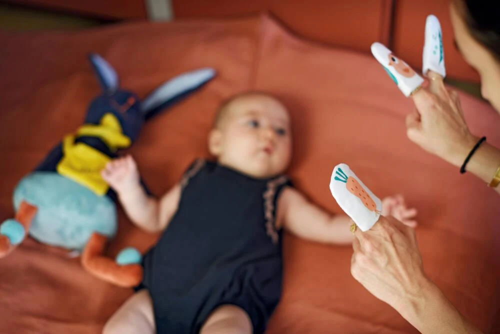 Cette peluche en velours ultra doux possède de grandes oreilles renfermant du papier bruissant. Gabin le lapin se promène toujours avec son sac bandoulière, dans lequel se trouve 3 marionnettes à doigts recto verso : carotte – brosse à dent, radis – haricot vert et chou – petit oiseau. En secouant la peluche, votre bout de chou entendra le grelot présent dans la tête de l’animal. Il pourra également retirer l’écharpe du lapin grâce au lien en velcro. Dimensions de la peluche : 45 cm. Composition : coton et polyester. Lavable à 30°.