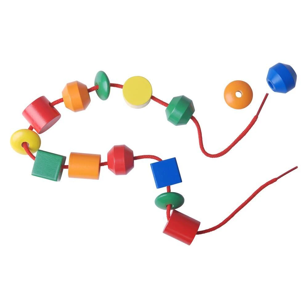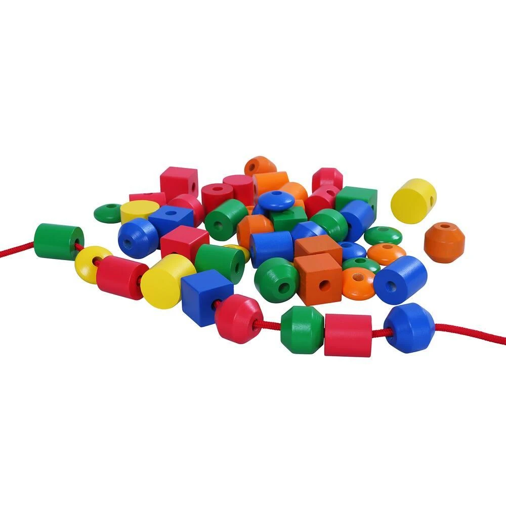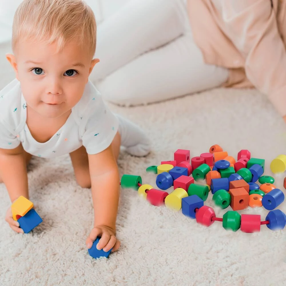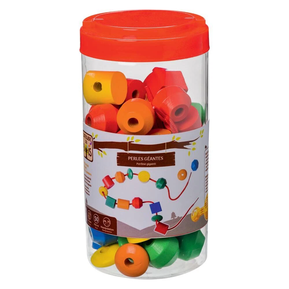 Perles géantes multicolores. 50 pièces de différentes formes. Dim. perles : 3-3.4 cm. Un lacet inclus. En bois. Livrées dans 1 baril, dimensions 12.60 x 12.60 x 23 cm. Développement de la motricité. Apprentissage des formes. Développement de l’imaginaire.