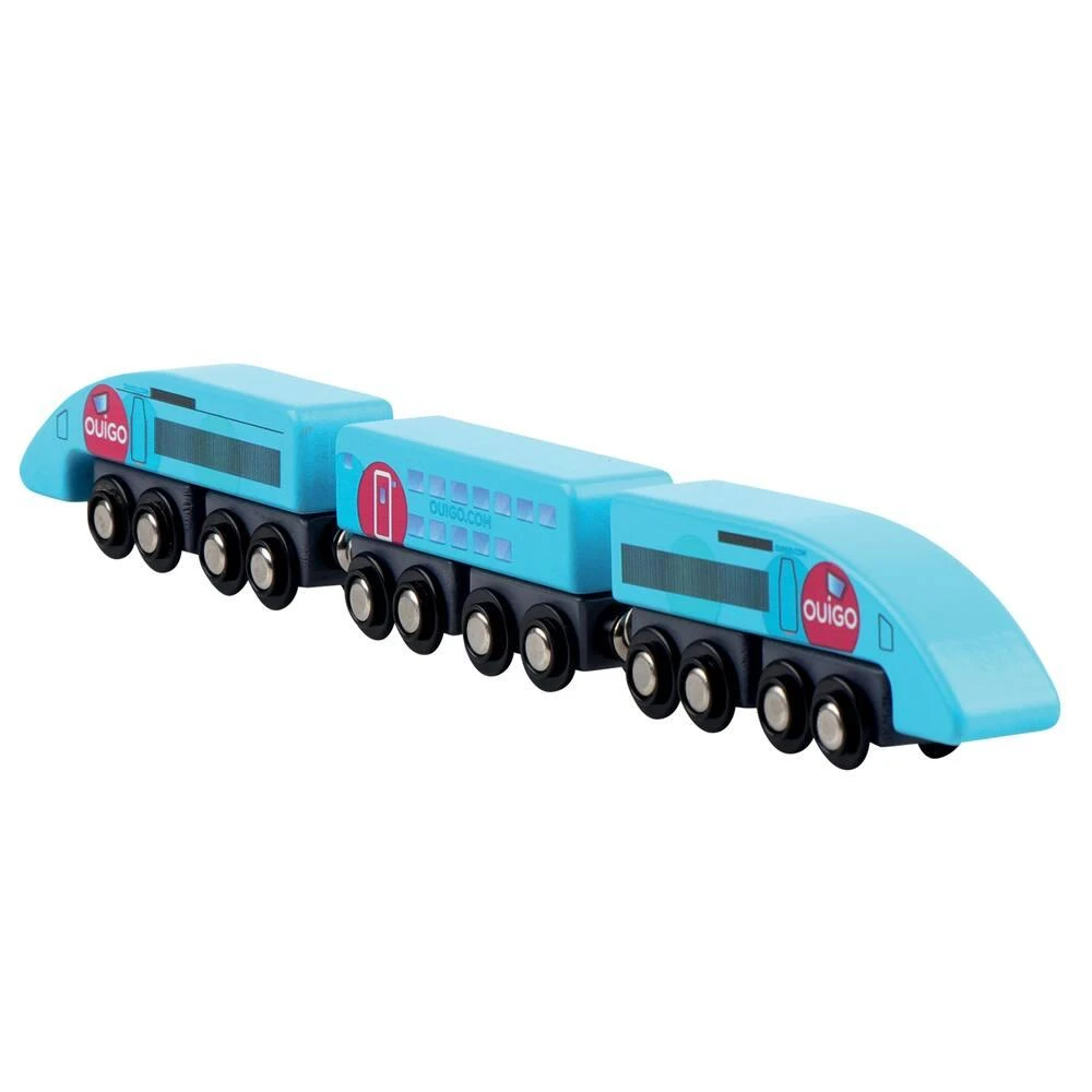 Un train à grande vitesse en bois de couleur bleu en 3 pièces : 2 locomotives et 1 wagon. Chaque compartiment de train à un bout aimanté pour pouvoir les rattacher tous ensemble. En bois. Livré sans rails. Les locomotives et wagons sont universels, ils s’adaptent sur tous les sets de train et routes des rails en bois standards. Un TGV moderne « OUIGO » en bois, comme le vrai que les enfants vont reconnaître facilement car on le retrouve dans chaque gare !