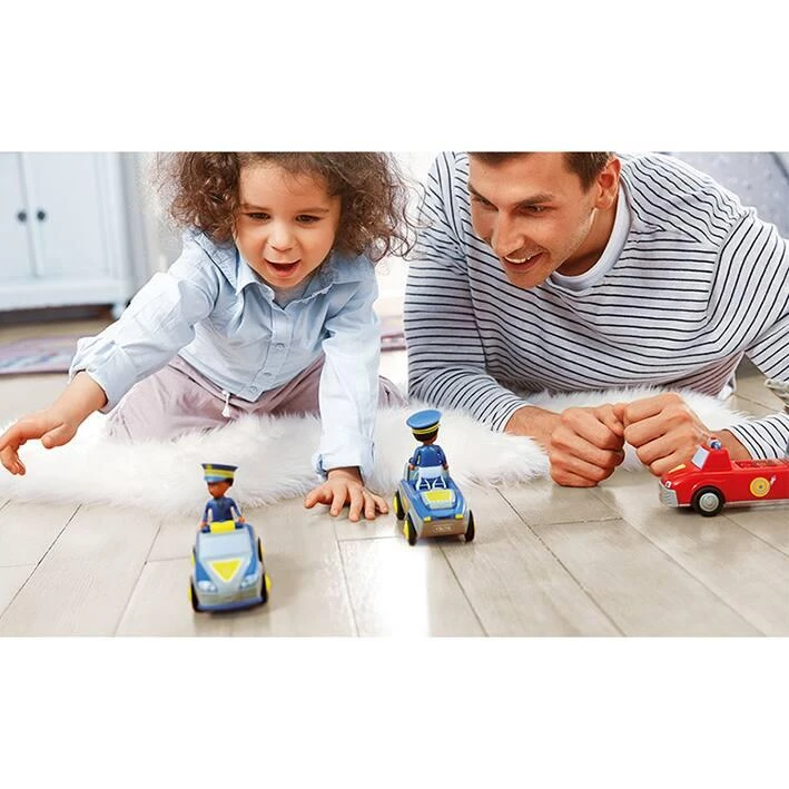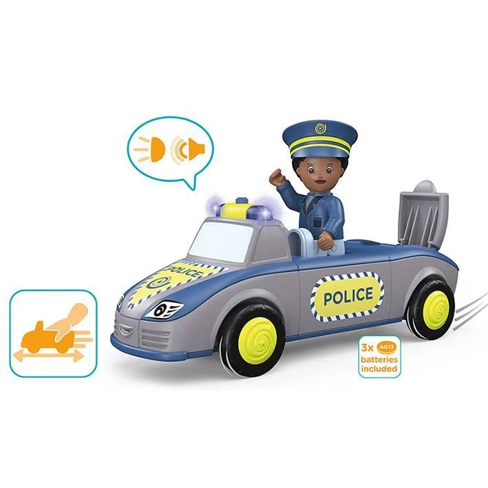 Halte ! Police ! Tom et Trusty maintiennent l’ordre et donnent un coup de main si besoin. Même chez les Toddys, il faut parfois veiller au grain et c’est pourquoi ils se déplacent beaucoup tous les deux. Si un embouteillage se produit, le gyrophare et la sirène de l’équipe de police super rapide permet de dégager rapidement la route. Ils foncent à travers le paysage et arrivent toujours rapidement. Mais ils n’interviennent pas uniquement dans les cas d’urgence. Parfois, les journées sont calmes et Trusty sécurise seulement une rue à l’aide de son panneau Stop, pendant que Tom arrête la circulation en sens inverse pour accompagner en toute sécurité une heureuse maman cane et ses petits qui traversent la route. En tout cas, ces deux-là ne s’ennuient jamais et sont heureux de chaque mission qui leur permet d’aider leurs amis. Un jouet haut de gamme palpitant avec un moteur à friction (moteur à volant) permettant de stimuler la motricité fine, l’endurance, la patience et de procurer beaucoup de plaisir. La figurine de Tom est articulée : la tête tourne, les bras se lèvent et les jambes peuvent être pliées. Le véhicule Trusty peut être démonté en trois parties et combiné avec d’autres véhicules Toddys. Des effets son et lumière soulignent les caractéristiques du véhicule. Le panneau rabattable « STOP POLICE » stimule l’expérience de jeu. Il est compatible avec des modules d’autres fabricants. Système siku « Click&Play » : combinaison facile grâce à un système de rotation et d’encliquetage des pièces du véhicule permettant de stimuler les facultés motrices et de procurer un plaisir de jeu durable. Une finition robuste de qualité siku.