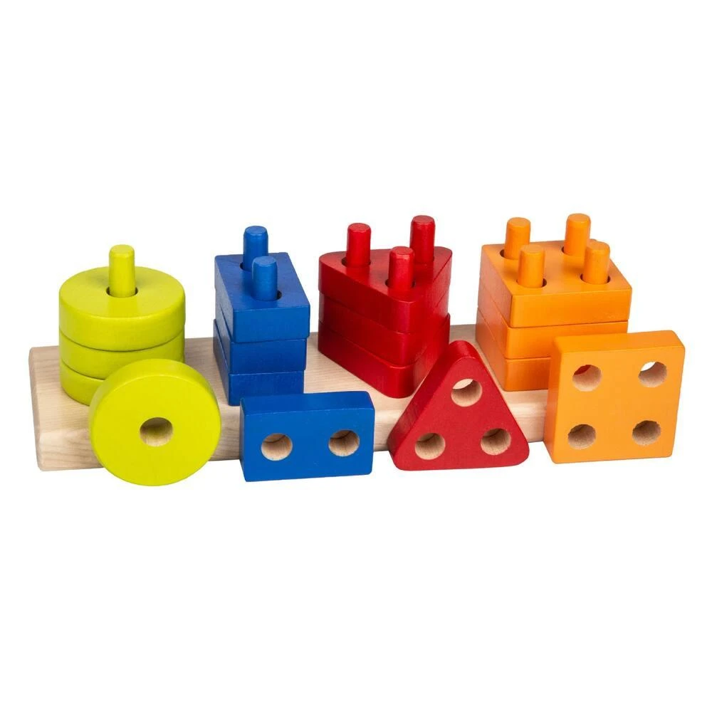 17 pièces au total. Base rectangulaire en bois naturel. 4 blocs de 4 formes différentes : rond, carré, rectangle et triangle. 4 coloris différents, chaque forme a un coloris : rouge, bleu, vert et orange. Permet de se familiariser avec les formes et de découvrir les couleurs. Développe la motricité fine et le raisonnement logique. En bois : hêtre et sycomore.