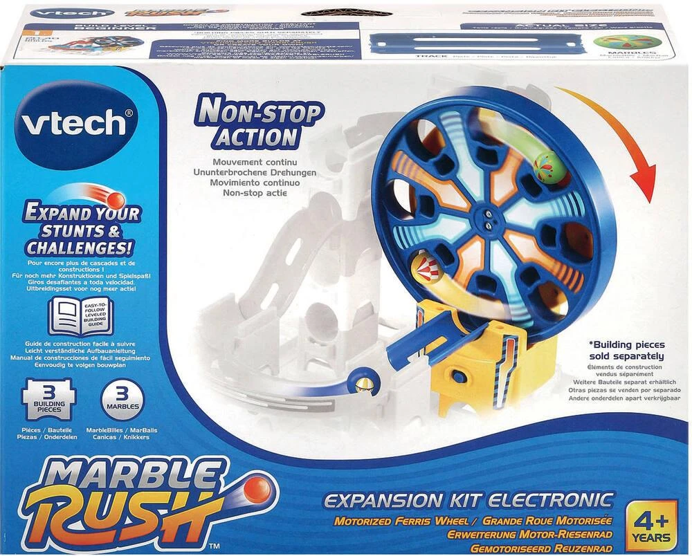 Une extension Marble Rush avec une grande roue motorisée pour davantage de spectacle ! Le kit comprend : 1 grande roue motorisée, 2 pistes de raccordement et 3 MarbleBilles. Génial ! La grande roue est dotée d’un moteur pour déplacer automatiquement les MarbleBilles d’un point à l’autre du circuit ! Compatible avec les autres sets de la gamme.