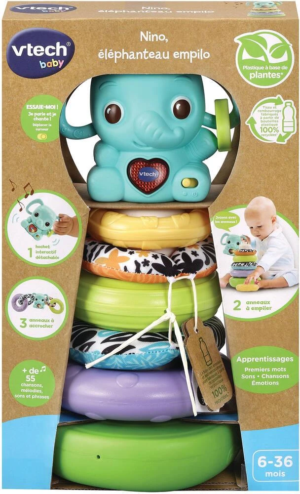 Une tour à empiler amusante et évolutive en plastique bio-sourcé ! Un grand classique revisité en version éco-conçue ! 3 en 1 : tour empilo, jeu d’assemblage grâce aux anneaux d’accroche et hochet électronique. Des anneaux texturés en plastique uni et des anneaux en tissu très colorés fabriqués à partir de bouteilles en plastique recyclé stimulent le développement sensoriel de l’enfant. Les anneaux peuvent être assemblés et utilisés sur la poussette par exemple. Grâce à Nino, bébé découvre les formes, les couleurs et les textures. Le bouton Coeur situé sur le ventre de l’éléphant déclenche des interactions lumineuses. Contient 70% de matériaux écologiques (plastique bio-sourcé). 3 anneaux en plastique et 2 en tissu.