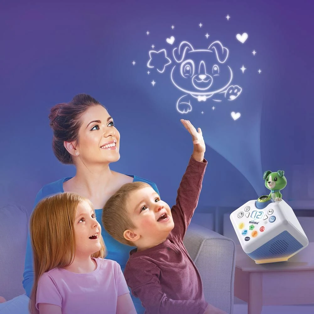 Un conteur d’histoires avec projection lumineuse pour s’endormir en histoire ou en chanson. Les différentes voix des personnages et narrateur, les sons réalistes et les mélodies donnent vie aux histoires. Plus de 80 contenus inclus : 19 contes (Les trois petits cochon, Cendrillon, La Belle et la Bête, La petite sirène…), 16 poésies classiques (poèmes français d’auteurs classiques), 14 fables (La Fontaine et fables d’autres pays), 9 histoires pour s’endormir, 23 chansons. Magique ! La projection accompagne les histoires et chansons et le petit chien réagit et s’anime différemment en fonction du conte choisi. Les parents peuvent également enregistrer leur propre histoire ou chanson personnalisée. Jusqu’à 10 minutes d’enregistrement. Un bouton pour activer une jolie veilleuse. Packs additionnels à télécharger gratuitement en ligne ! Une minuterie permet de choisir le temps d’écoute. Mémoire interne pouvant contenir : 100 histoires de 4 minutes et 35 mélodies de 3 minutes. Contenus additionnels à télécharger gratuitement. Fonctionne avec piles ou sur adaptateur secteur inclus.