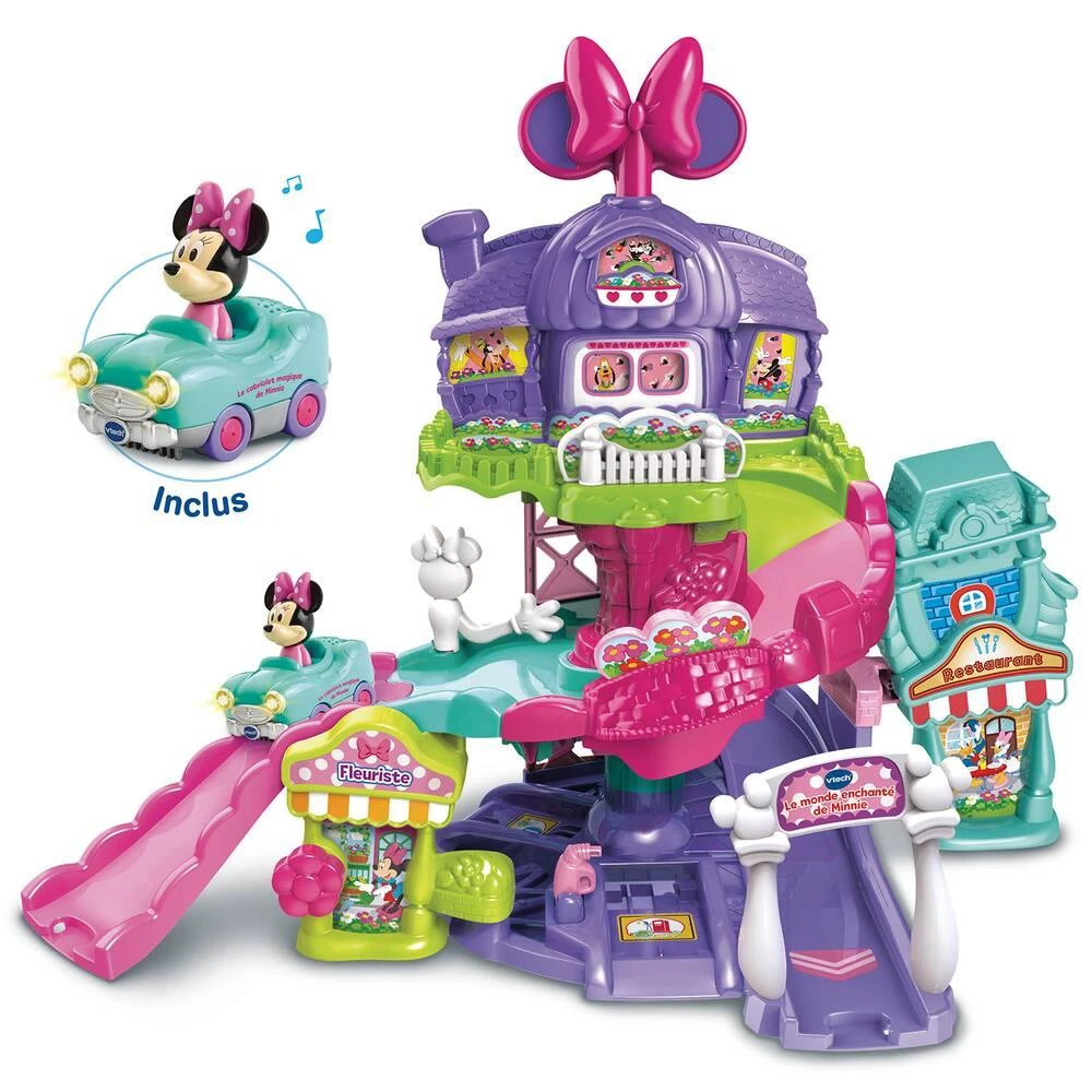 Minnie parle et chante dans son cabriolet magique. Pour faire interagir le personnage, il suffit d’appuyer dessus ou de faire passer le véhicule sur une zone magique. À l’aide du lanceur, Minnie descend à toute vitesse la piste ! L’enfant développe sa motricité en manipulant de nombreux éléments : fleur, aiguillage, pompe à essence et bien plus encore ! Magique ! En appuyant sur le nœud papillon au sommet de la maison, Figaro le chat apparaît. 3 chansons, 4 mélodies, des phrases et des sons rigolos rythment le jeu. 4 Zones Magiques. Avec la voix de Minnie ! Age : de 1 à 3 ans.