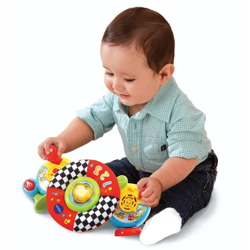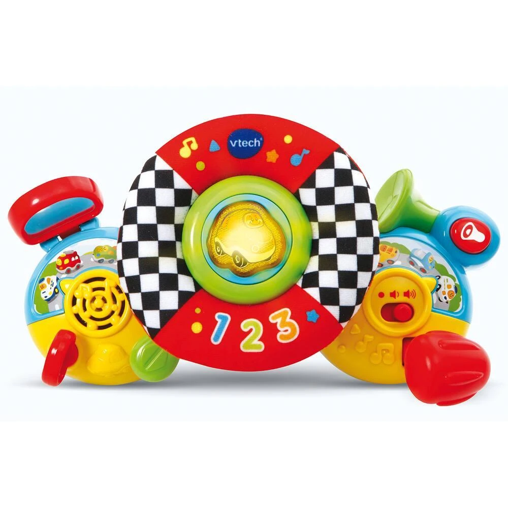 plus confortable. Bébé tourne le volant pour déclencher des phrases amusantes et des sons rigolos de moteur. Nombreux éléments à manipuler : une clef à tourner, un levier de vitesse, un bouton Klaxon, un rétroviseur avec un miroir… Bébé découvre les opposés et de nouveaux mots de vocabulaire. Un miroir en forme de rétroviseur pour se regarder. 2 en 1 : le volant se détache pour jouer au sol. 4 chansons et 20 mélodies. Réglage du volume sonore et arrêt automatique. Il convient aux enfants de 1 à 3 ans.